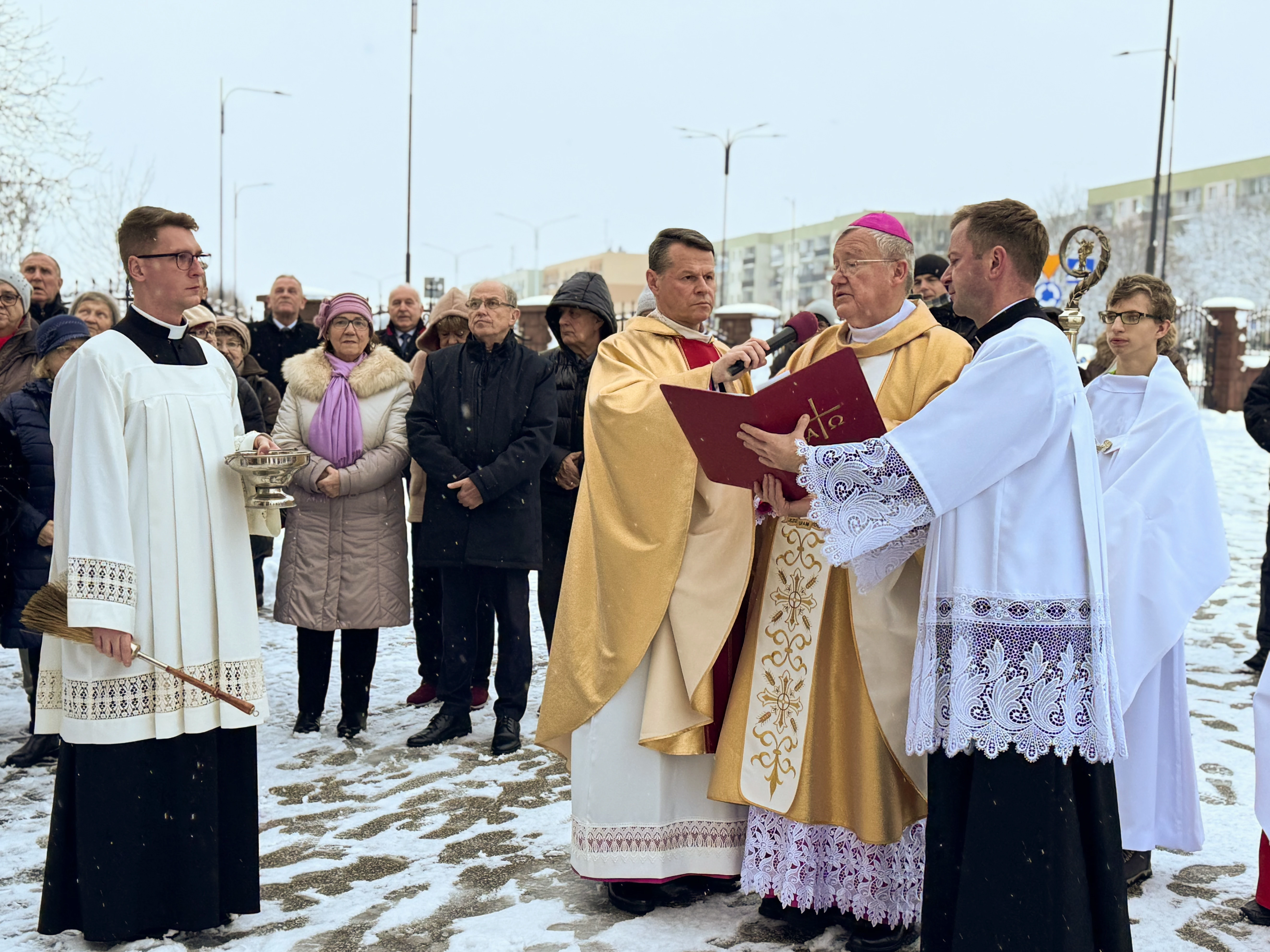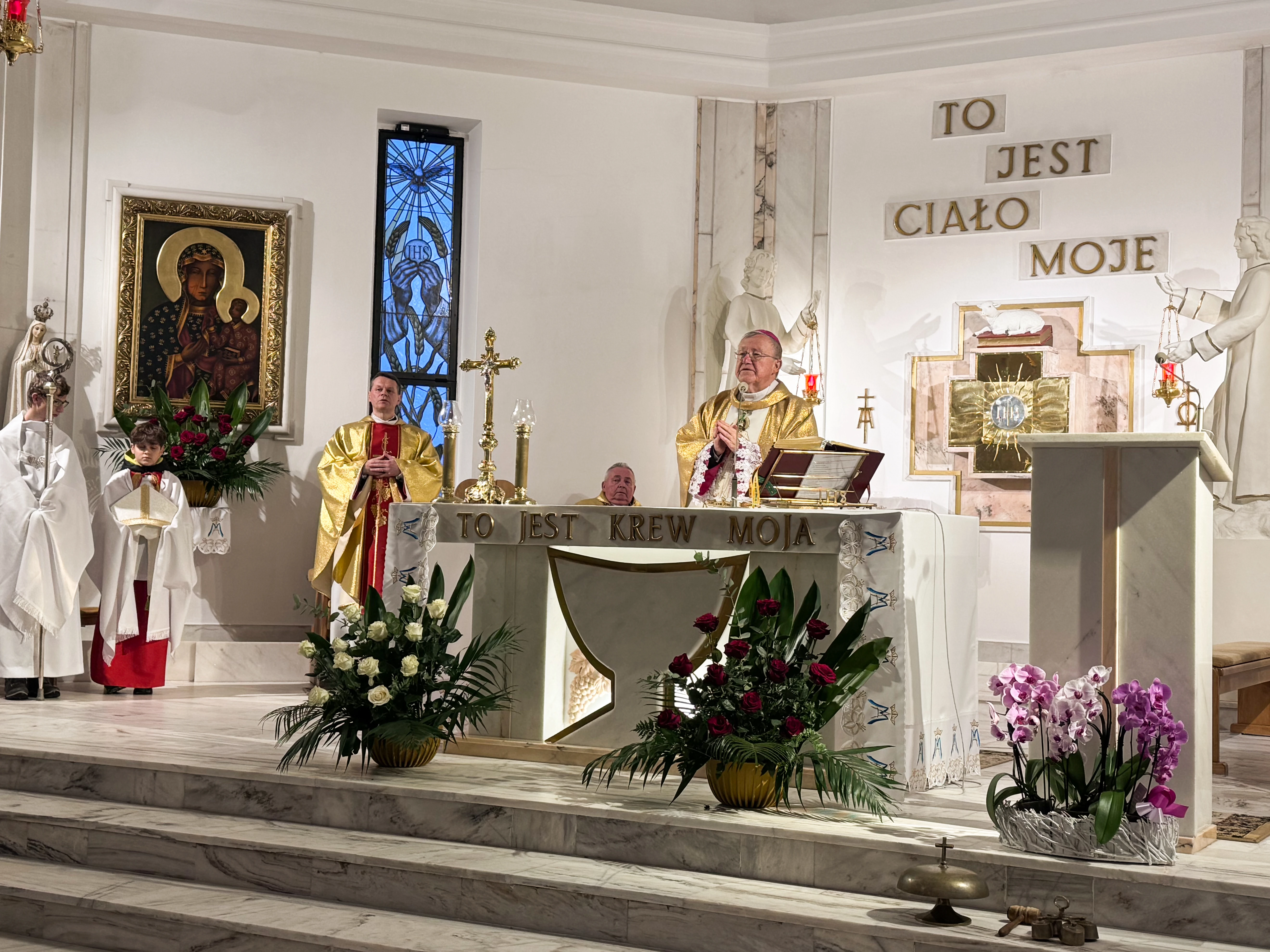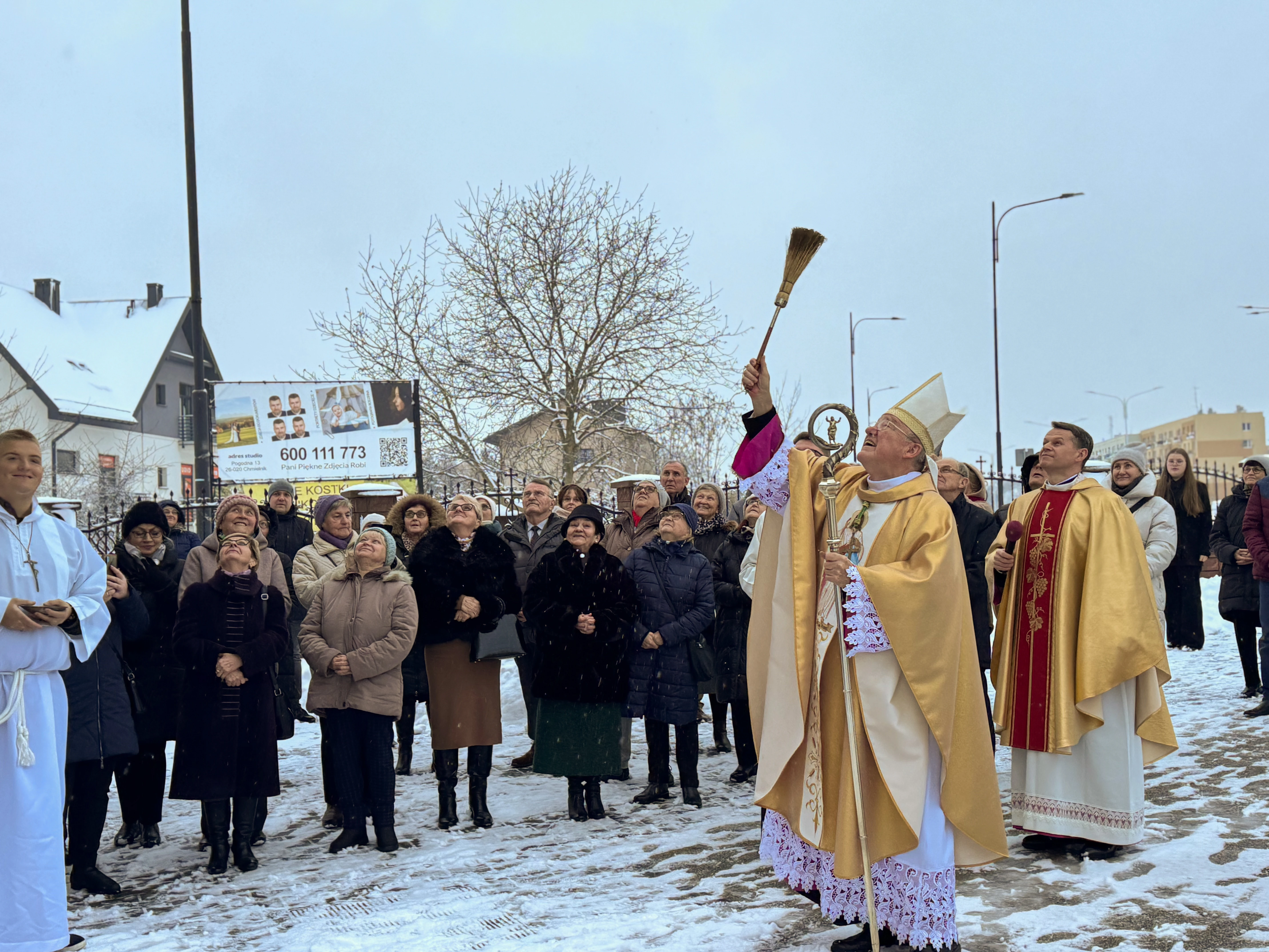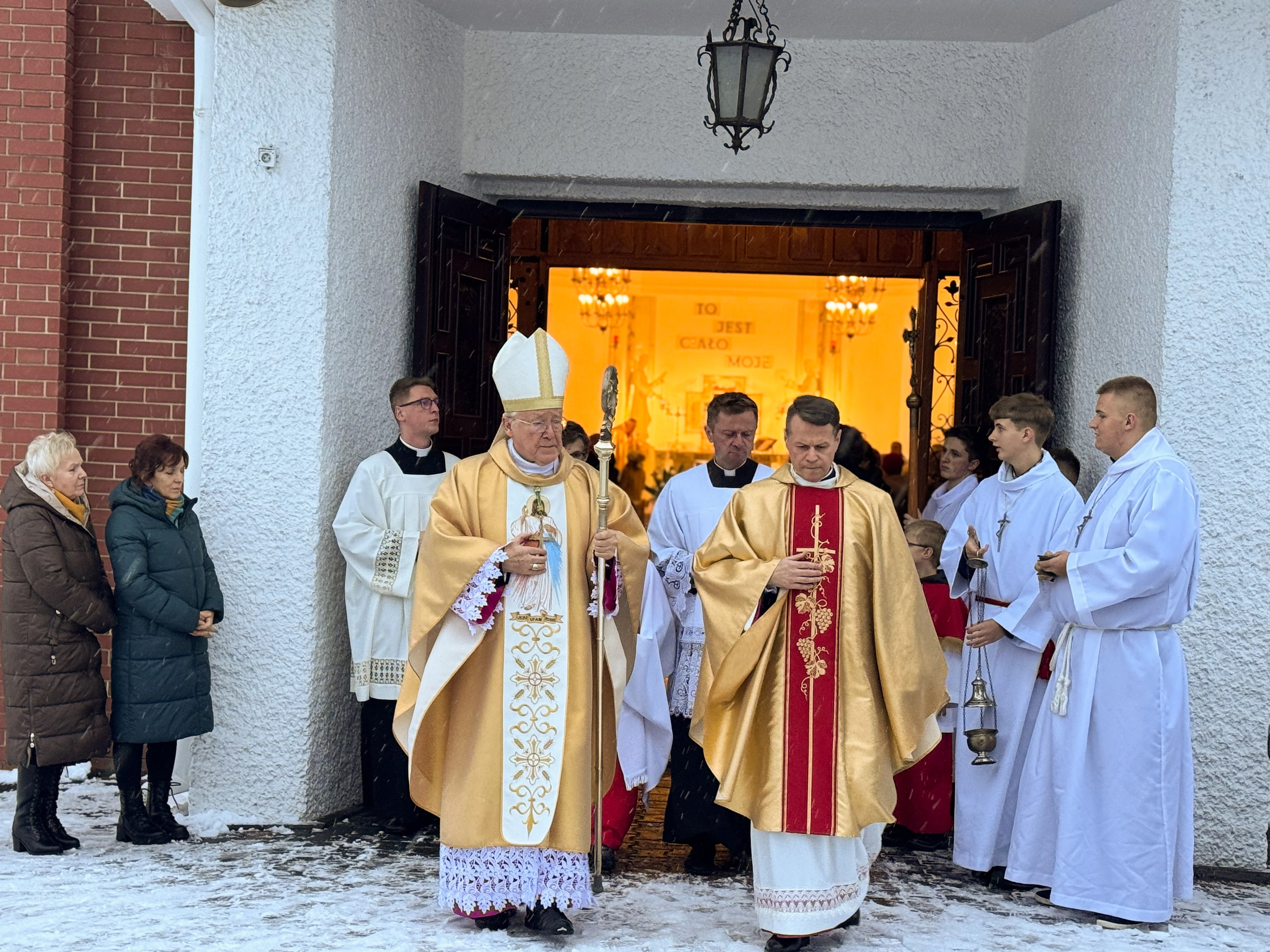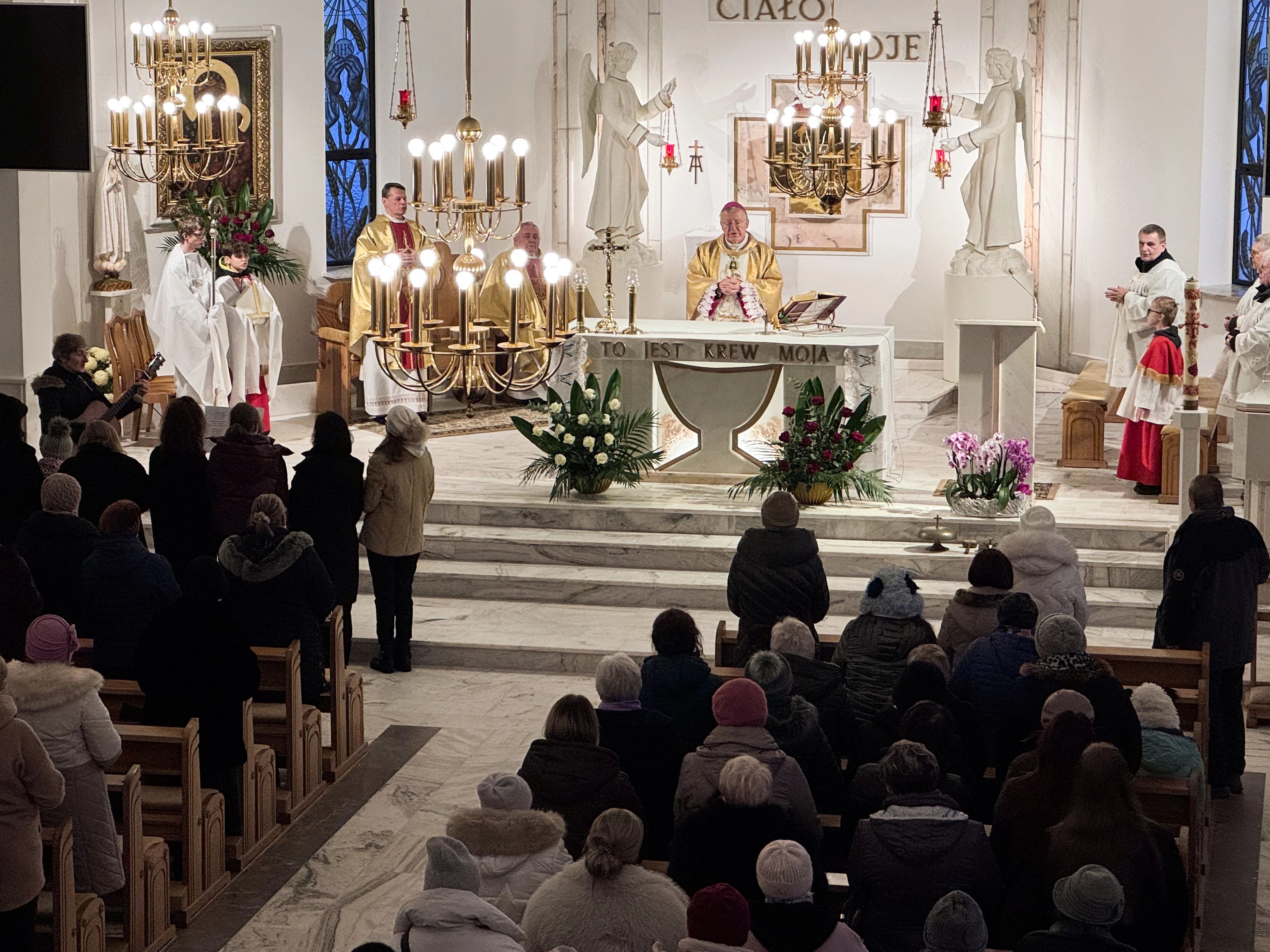 Niedziela, 23 listopada br., zapisała się złotymi zgłoskami w historii parafii. To właśnie tego dnia przeżywaliśmy jedno z najważniejszych wydarzeń w kalendarzu liturgicznym - Uroczystość Jezusa Chrystusa Króla Wszechświata, która w tym roku nabrała szczególnego znaczenia. Kościół wypełnił się wiernymi, którzy przybyli na uroczystą Mszę Świętą pod przewodnictwem Jego Ekscelencji Księdza Biskupa Andrzeja Kalety. Jego obecność nadała celebracji, powagi i uroczystego charakteru. Szczególnym momentem było poświęcenie przez Księdza Biskupa nowych insygniów królewskich dla figury Jezusa Chrystusa Króla Wszechświata. Nasza parafialna figura, która towarzyszy nam od lat, otrzymała piękną tiarę oraz złote serce, symbole królewskiej godności Chrystusa i Jego nieskończonej miłości do każdego z nas. Nowa tiara na głowie Chrystusa Króla to znak naszej wiary i przypomnienie, że uznajemy Go za Pana naszego życia. Złote serce mówi zaś o tym, jak Chrystus króluje przez miłość, która oddała się całkowicie za nasze zbawienie. Przed obliczem Chrystusa Króla złożyliśmy Mu wszystko: nasze codzienne troski i radości, nasze obawy i nadzieje, naszą przeszłość i przyszłość. Zapach kadzidła, blask świec i wspólny śpiew sprawiły, że uroczystość nabrała prawdziwie duchowego, podniosłego charakteru.
